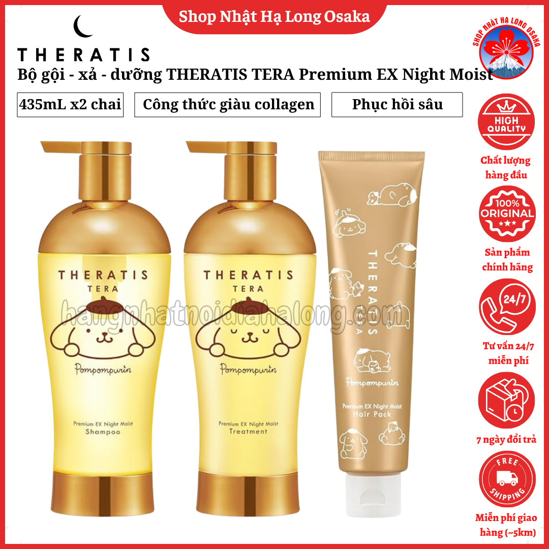 Bộ gội - xả - dưỡng tóc THERATIS TERA Premium EX Night Moist – Pompompurin Limited Edition là bộ 3 sản phẩm chăm sóc tóc cao cấp đến từ Nhật Bản, giúp phục hồi chuyên sâu trong lúc ngủ, mang lại mái tóc mềm mại, bồng bềnh và bóng khỏe mỗi sáng thức dậy. Thiết kế phiên bản giới hạn với nhân vật Pompompurin đáng yêu – món quà hoàn hảo cho những ai yêu thích sự dễ thương và chăm sóc bản thân mỗi ngày.