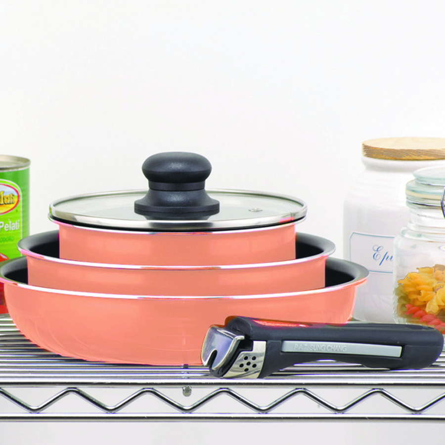 Khi cần cho nồi/chảo vào lò nướng, lò vi sóng hoặc xếp gọn, hãy tháo tay cầm bằng cách bấm nút nhả.