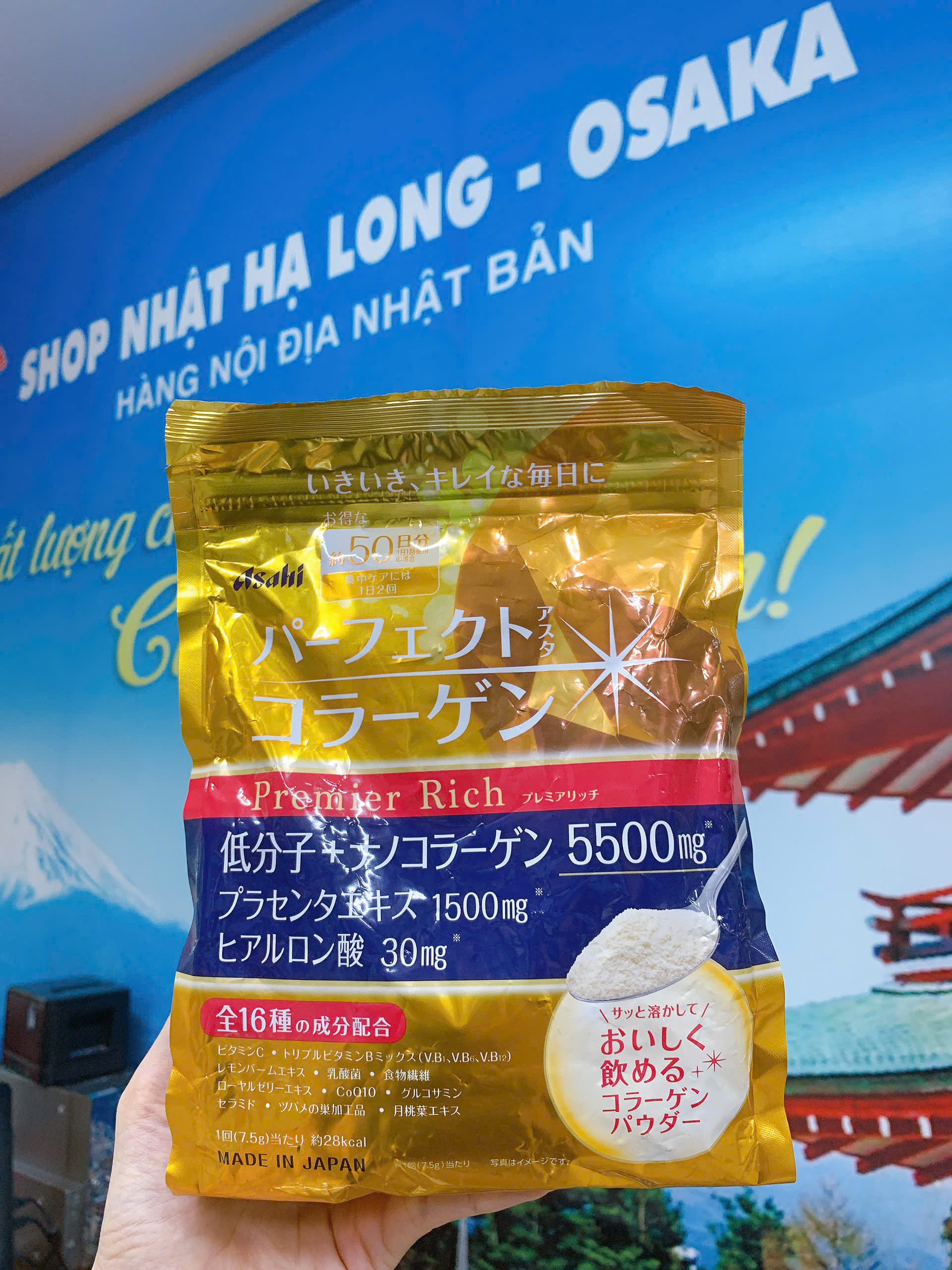 • Bột Collagen Perfect Asta Premier Rich là giải pháp làm đẹp toàn diện từ Nhật Bản, cung cấp 5.500mg nano collagen và collagen phân tử thấp mỗi ngày cho làn da săn chắc, đàn hồi và tươi trẻ hơn. Công thức chứa 16 thành phần làm đẹp cao cấp như nhau thai, ceramide, axit hyaluronic, CoQ10, chất xơ và nhóm vitamin B hỗ trợ cấp ẩm sâu, mờ thâm nám, giảm nếp nhăn và tăng sức khỏe tóc móng. Dễ hòa tan, hương vị cải tiến, lý tưởng khi dùng cùng cà phê hoặc thức uống yêu thích, giúp bạn duy trì nét đẹp rạng rỡ mỗi ngày.