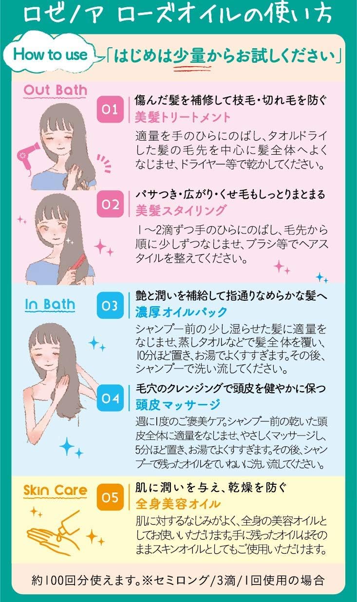 Cấp ẩm đa năng cho cả tóc và da: Không chỉ dành riêng cho tóc, Rosenoa còn có thể sử dụng như một loại dầu dưỡng da, giúp làm mềm các vùng da khô như tay, khuỷu tay hoặc body, mang lại làn da mịn màng và đủ ẩm.