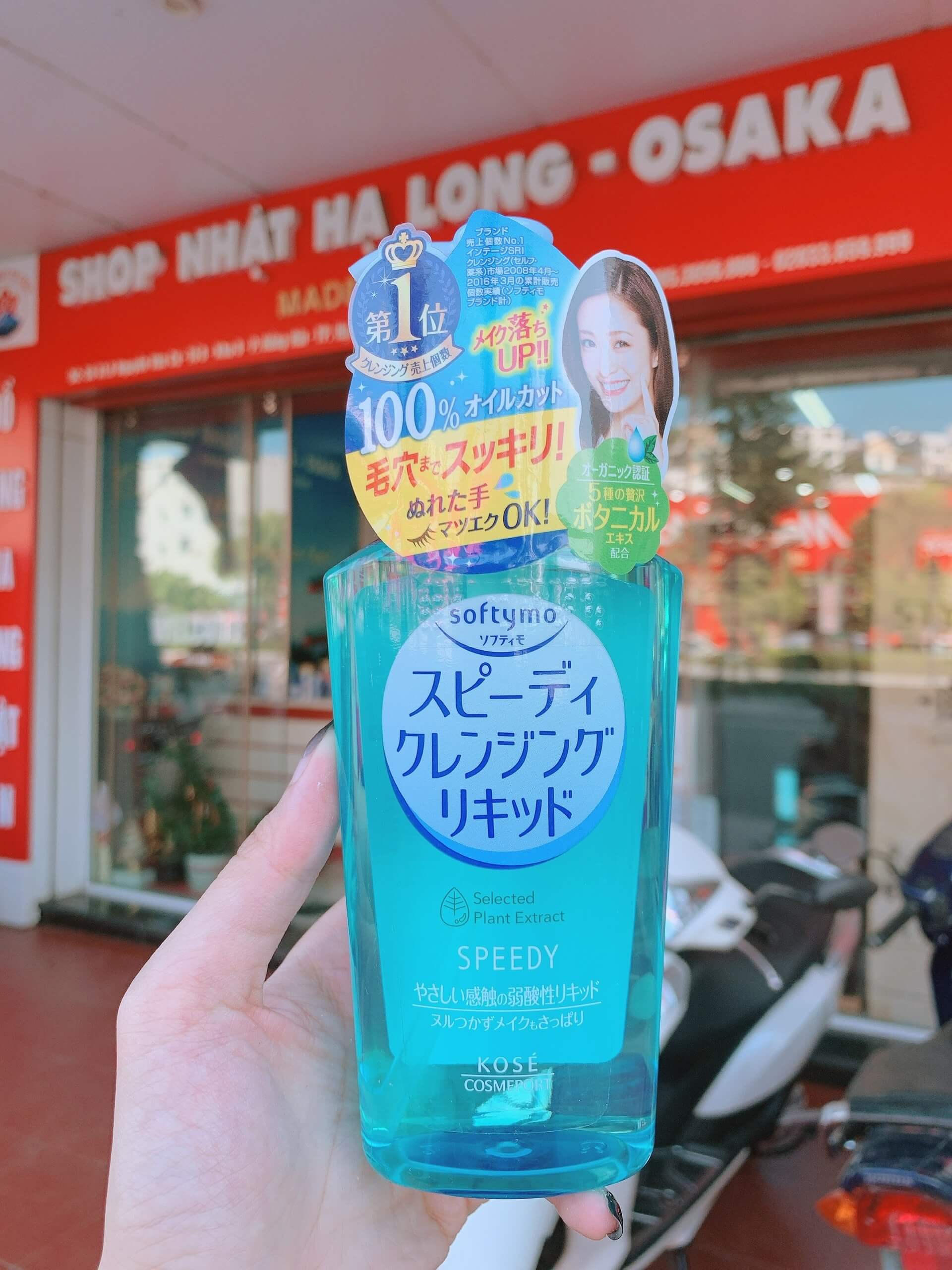 Nước tẩy trang Kose Speedy Cleansing Liqid 230ml (màu xanh) có thể loại bỏ được các lớp trang điểm cứng đầu, và cả những loại phấn trang điểm chống nước. Đem lại cho người dùng một làn da sạch sẽ, thông thoáng. Nước tẩy trang tác dụng nhanh Softymo 230ml Kose cung cấp độ ẩm cho da nhờ có chứa thành phần Glycerin, tạo cho làn da có độ đàn hồi tối ưu.