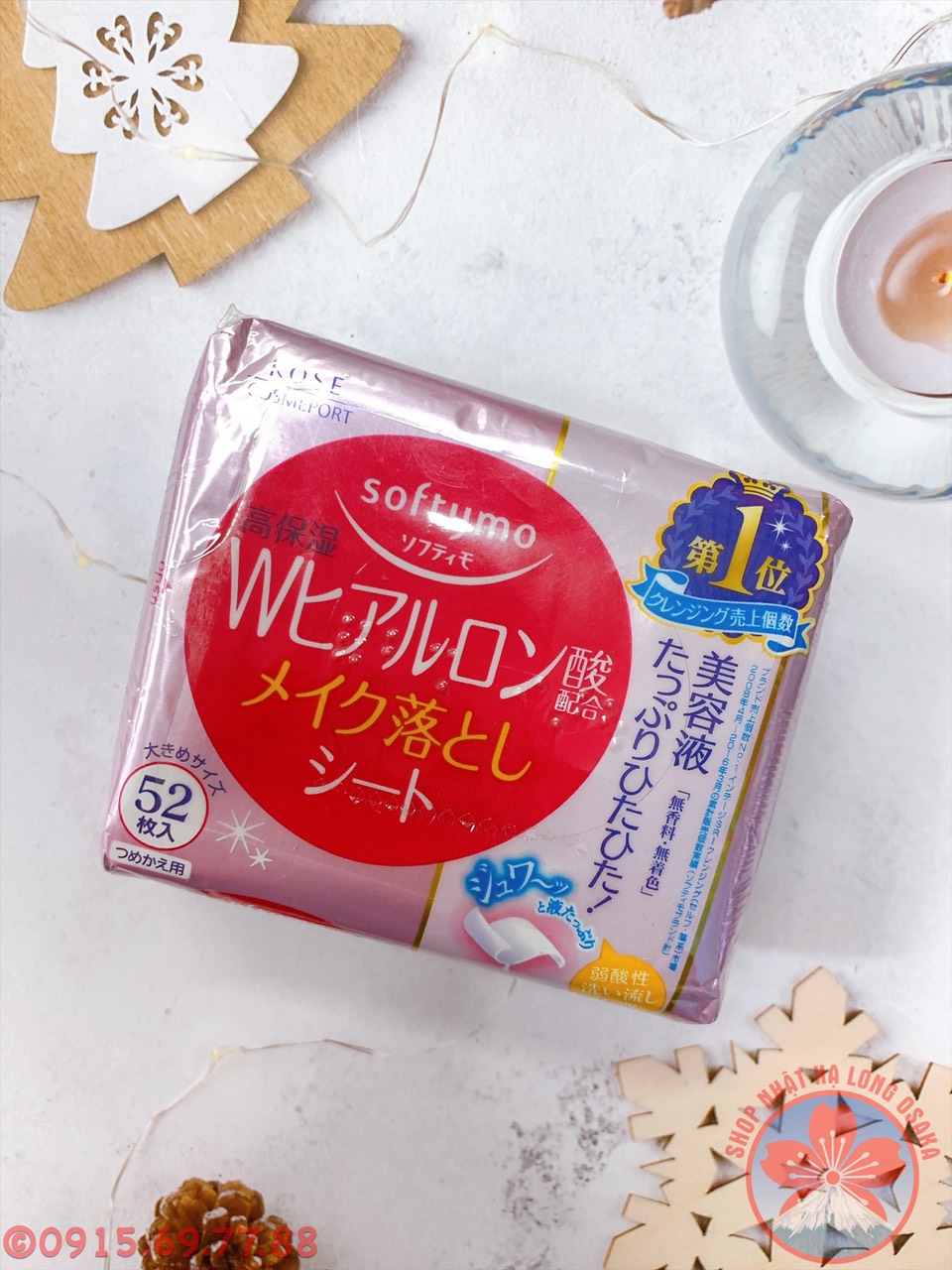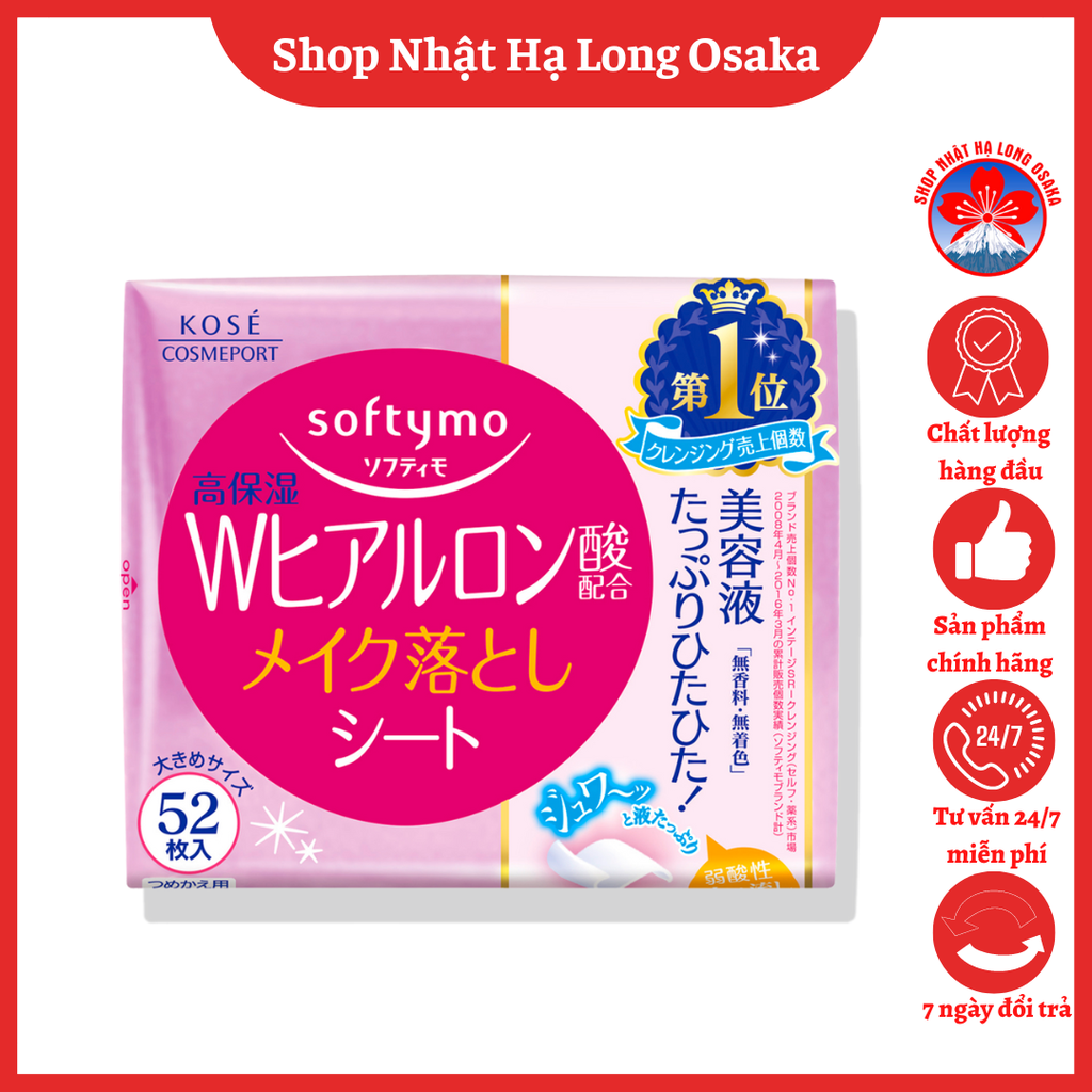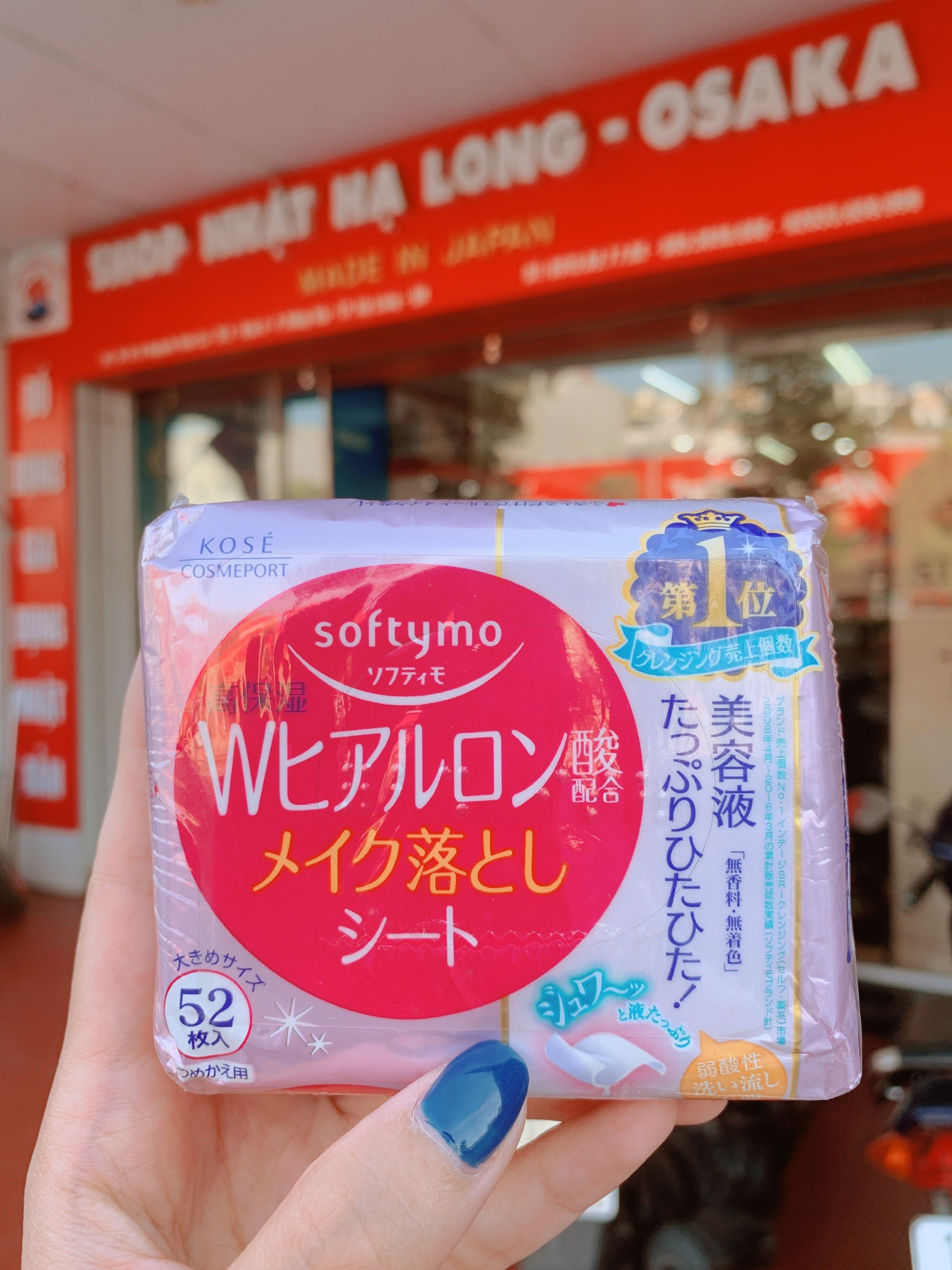 - Khăn giấy ướt tẩy trang Kose Softymo Makeup Remover Sheet (Hyaluronic Acid) 52 miếng màu hồng có khả năng tăng cường độ ẩm cần thiết cho làn da nên rất thích hợp với những bạn có làn da khô ráp, thiếu sức sống.