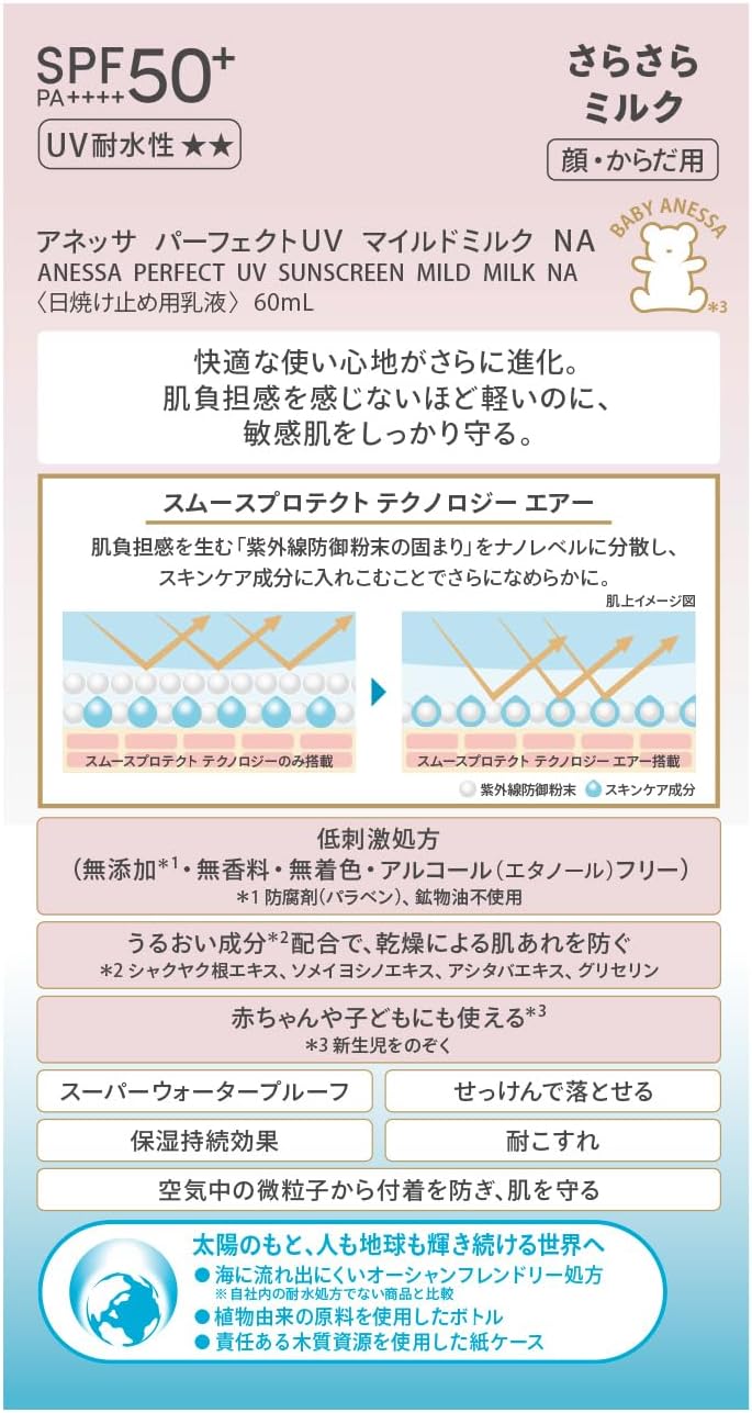 Shiseido Anessa Perfect UV Sunscreen Mild Milk SPF50+ PA++++ – kem chống nắng dịu nhẹ cho da nhạy cảm, an toàn cho trẻ từ 1 tuổi. Công nghệ Smooth Protect Air cho lớp sữa mỏng nhẹ, thẩm thấu nhanh, chống nước – mồ hôi, bảo vệ da toàn diện khỏi UVA/UVB, đồng thời dưỡng ẩm tự nhiên từ chiết xuất thực vật.