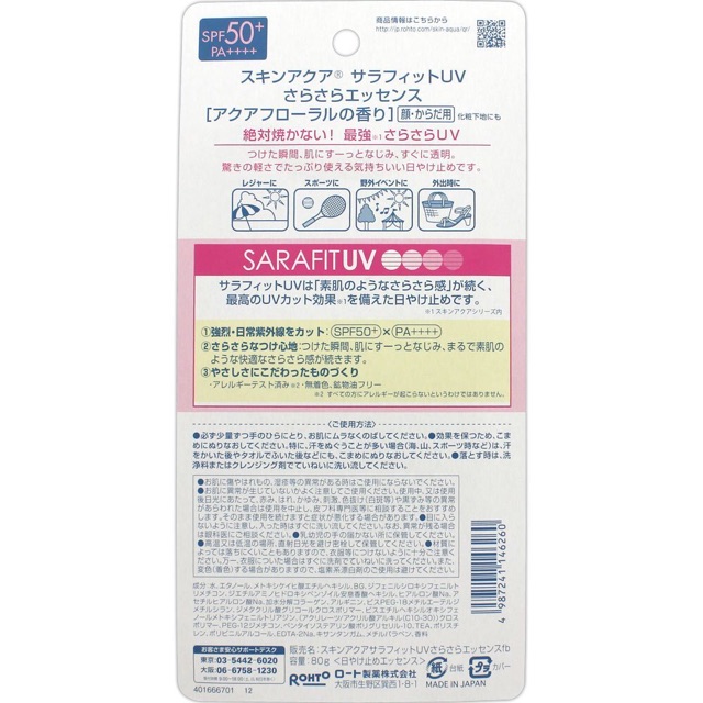 Kem chống nắng Skin Aqua Sarafit SPF50+ PA++++ màu hồng là dòng chống nắng có hương hoa nhẹ nhàng, được chiết xuất từ thành phần trà xanh, vitamin C, Collagen, Amino Acid và hyalurionic Acic. Nhờ khả năng chống nắng đạt SPF50+ và PA++++ nên các nàng có thể thoải mái đi biển mà không lo về da.