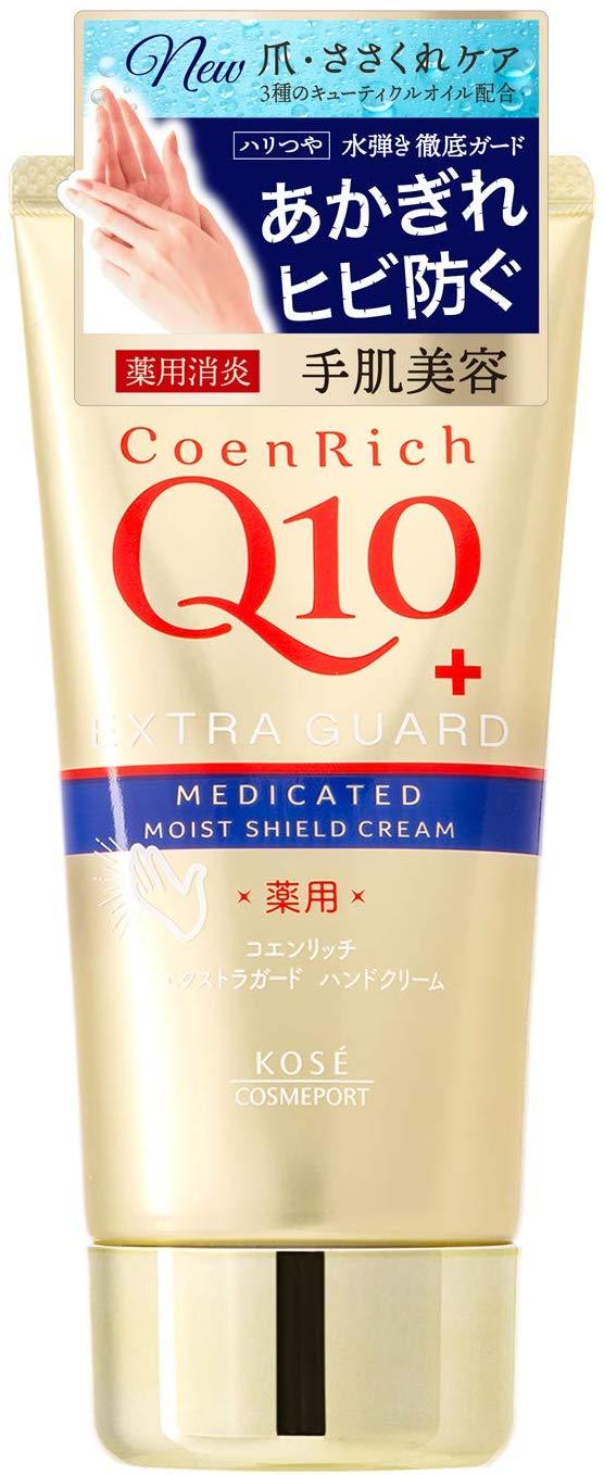 Kem dưỡng da tay cấp ẩm CoenRich Q10 Extra Guard Medicated Moist Shield Cream 80g: chứa coenzym Q10 giúp bảo vệ tay khỏi nước và khô, nguyên nhân gây nứt nẻ tay. Kem dưỡng giúp cung cấp độ ẩm sâu, dưỡng da tay căng mịn và mềm mượt. Dipotassium Glycyrrhizinate là hoạt chất ngăn ngừa viêm, làm dịu và giảm kích ứng da. Chăm sóc móng tay và tay cùng lúc với 3 loại dầu dầu jojoba, dầu hạnh nhân và squalane làm mờ các nếp nhăn khô và lão hóa. Hyaluronic Acid, Collagen và dầu khoáng có tác dụng dưỡng ẩm và làm đẹp cao.