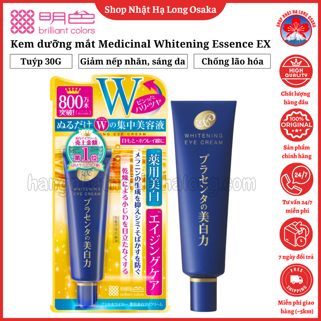 A: Medicinal Whitening Essence EX giúp làm trắng vùng da mắt, giảm quầng thâm, cải thiện nếp nhăn nhỏ và chống lão hóa nhờ sự kết hợp giữa chiết xuất nhau thai và collagen.