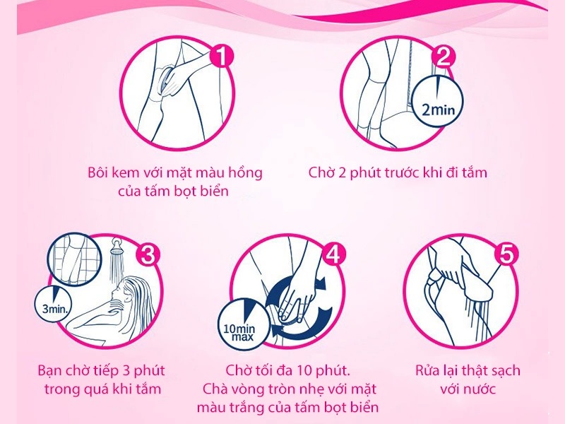 - Sau 5 phút kem tiếp xúc với da, bạn sử dụng phần mặt trắng của tấm bọt biển đi kèm chà nhẹ nhàng theo vòng tròn để lấy đi phần lông cần tẩy. Lưu ý: Nếu lông bạn hơi khó tẩy, bạn có thể để thêm 5 phút, nhưng không được để quá 10 phút. Nếu da của bạn quá mẫn cảm, bạn có thể sử dụng phần mặt hồng của tấm bọt biển để tẩy lông.