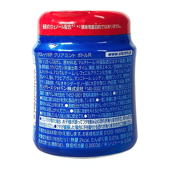 - Maltitol (sản xuất tại Thái Lan hoặc Trung Quốc), xi-rô tinh bột giảm, chiết xuất trà xanh / chất tạo ngọt (sorbitol, xylitol, hợp chất aspartame / L-phenylalanin, acesulfame K), kẹo cao su, hương vị, kẹo cao su arabic, mannitol, lecithin, sáp thực vật, phẩm màu (cây dành dành, chất diệp lục đồng), (một phần chứa đậu nành)