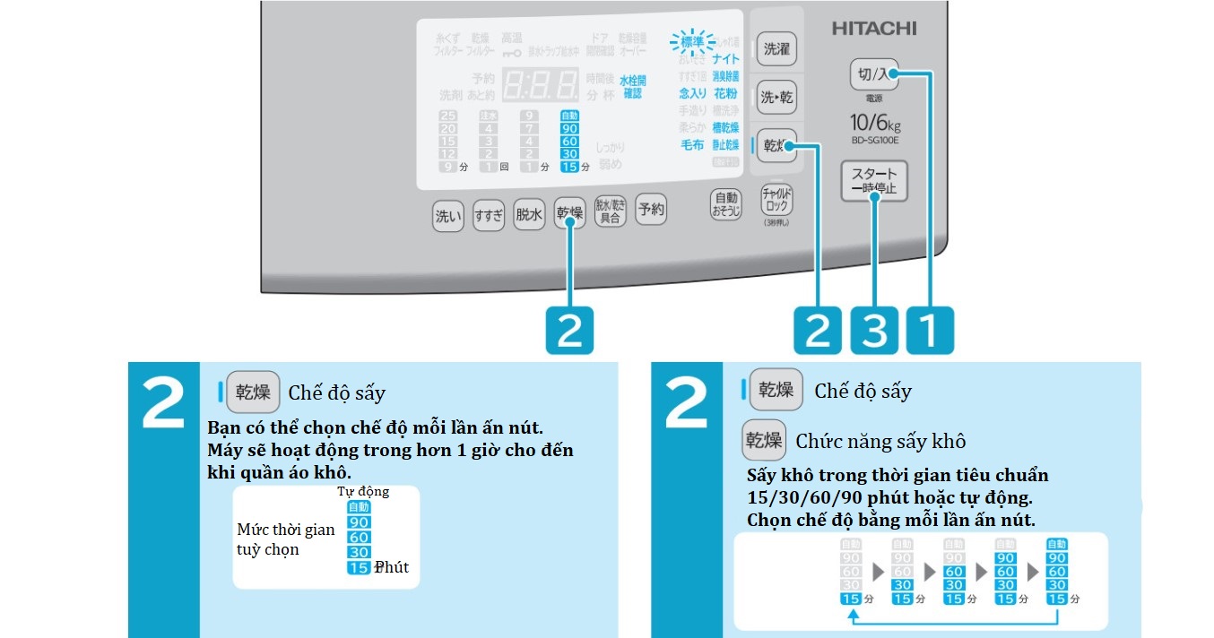 | Chức năng hẹn giờ | Giặt ủi | 3 đến 24 giờ |