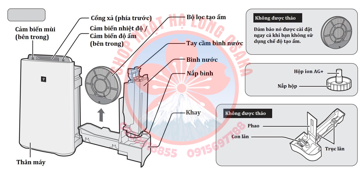 Lõi lọc ion Ag⁺ có thể được làm ẩm bằng nước sạch. "Lõi lọc ion Ag⁺" có thể dễ dàng gắn vào nắp bình, giúp ngăn chặn vi khuẩn trong nước gây ra cặn bẩn và mùi hôi trong bình và khay. Bạn có thể giữ cho nó sạch sẽ bằng cách thay thế nó mỗi năm một lần (Ước tính khi sử dụng 2,5 L mỗi ngày với hoạt động làm sạch không khí được làm ẩm. Tùy theo chất lượng nước và tần suất sử dụng mà thời gian thay thế có thể sớm hơn.).
