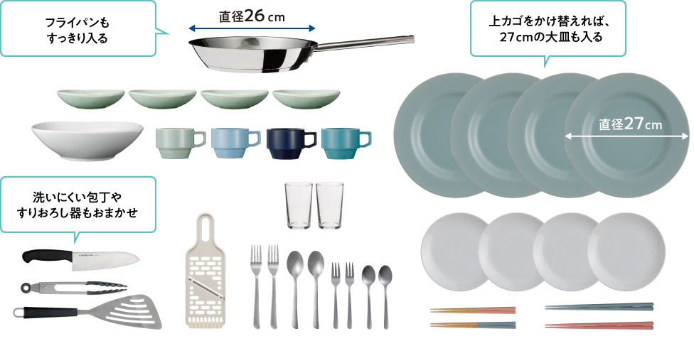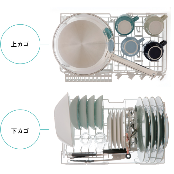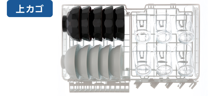 Khả năng rửa lên đến 6 bộ bát đĩa: 12 bát nhỏ, 5 đĩa 27cm, 4 đĩa vừa, 10 đĩa nhỏ và 6 cốc