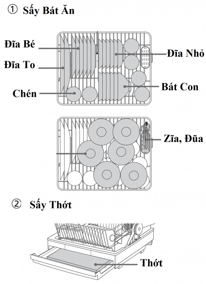 - Cách sắp xếp: Chúng ta có thể tùy chỉnh vị trí bát đĩa và thớt sao cho phù hợp với không gian sấy nhất để có thể tiết kiệm không gian sấy và thời gian sấy.