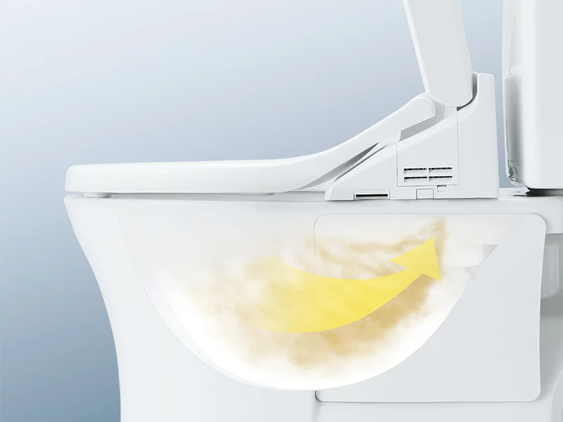 A: Khi người dùng ngồi xuống, máy bắt đầu hút khí trong bồn cầu qua bộ lọc khử mùi chuyên dụng. Sau khi đứng dậy, chế độ khử mùi tăng cường sẽ tiếp tục hoạt động với lực hút gấp đôi giúp loại bỏ khí thải, vi khuẩn mùi và giữ không khí trong lành. Điều này giúp phòng vệ sinh luôn sạch mùi – nâng tầm trải nghiệm của cả gia đình.