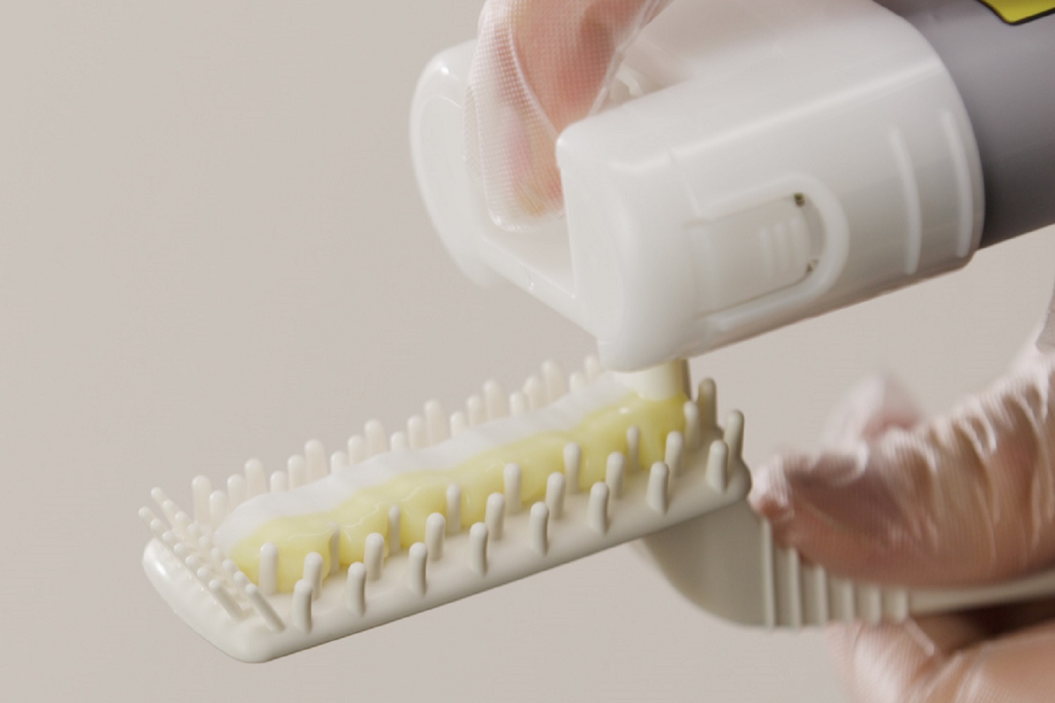 - Bấm nút để bơm thuốc nhuộm vào phần rãnh giữa của lược có sẵn trong hộp sản phẩm