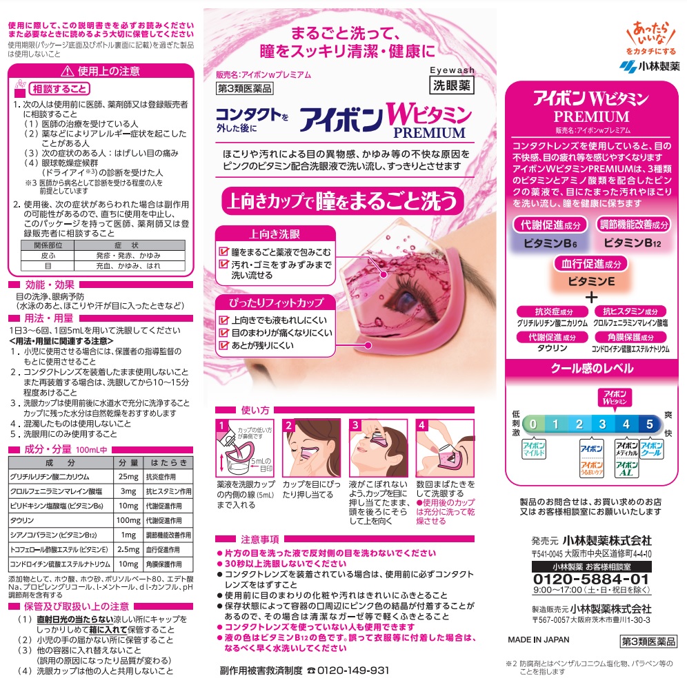 Nước rửa mắt Kobayashi Eyebon W Vitamin Premium là loại nước rửa mắt giúp rửa sạch bụi bẩn khỏi mắt, giữ cho đôi mắt khỏe mạnh, tinh anh bằng dung dịch dịu nhẹ, chứa 3 loại vitamin (vitamin B6, vitamin B12, vitamin E) cùng các axit amin khác.