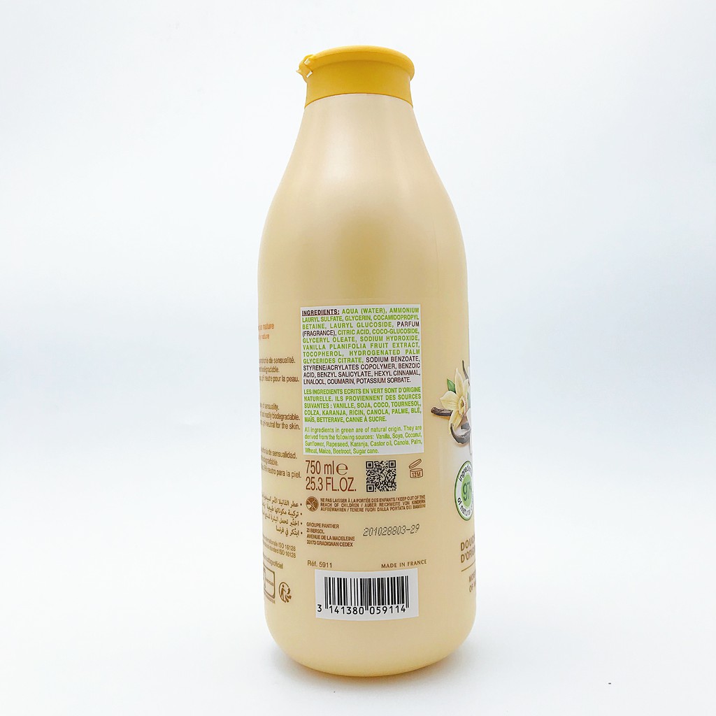 Aqua (water), Ammonium lauryl sulfate, Glycerin, Cocamidopropyl betaine, Lauryl glucoside, Parfum (fragrance), citric acid, coco-glucoside, Glyceryl oleate, Sodium hydroxide, Vanilla planifolia fruit extract, Tocopherol, Hydrogenated palm glycerides citrare,...