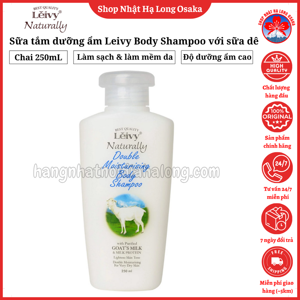 Sữa tắm Leivy chiết xuất sữa dê và protein sữa giúp làm sạch nhẹ nhàng, dưỡng ẩm sâu, giữ da mềm mại và mịn màng lâu dài. Kết cấu tạo bọt dày mịn, hương hoa ngọt ngào dịu nhẹ như nước hoa. Phù hợp cho da khô, nhạy cảm. Dung tích lớn tiết kiệm, dùng được cho cả gia đình.