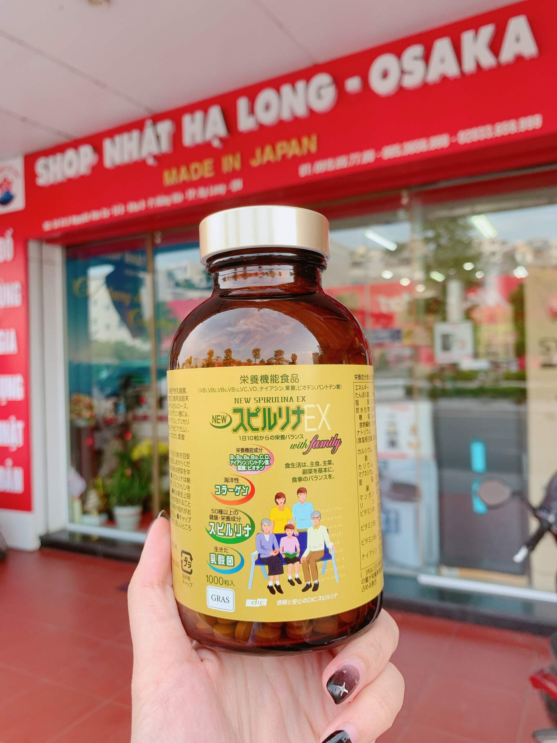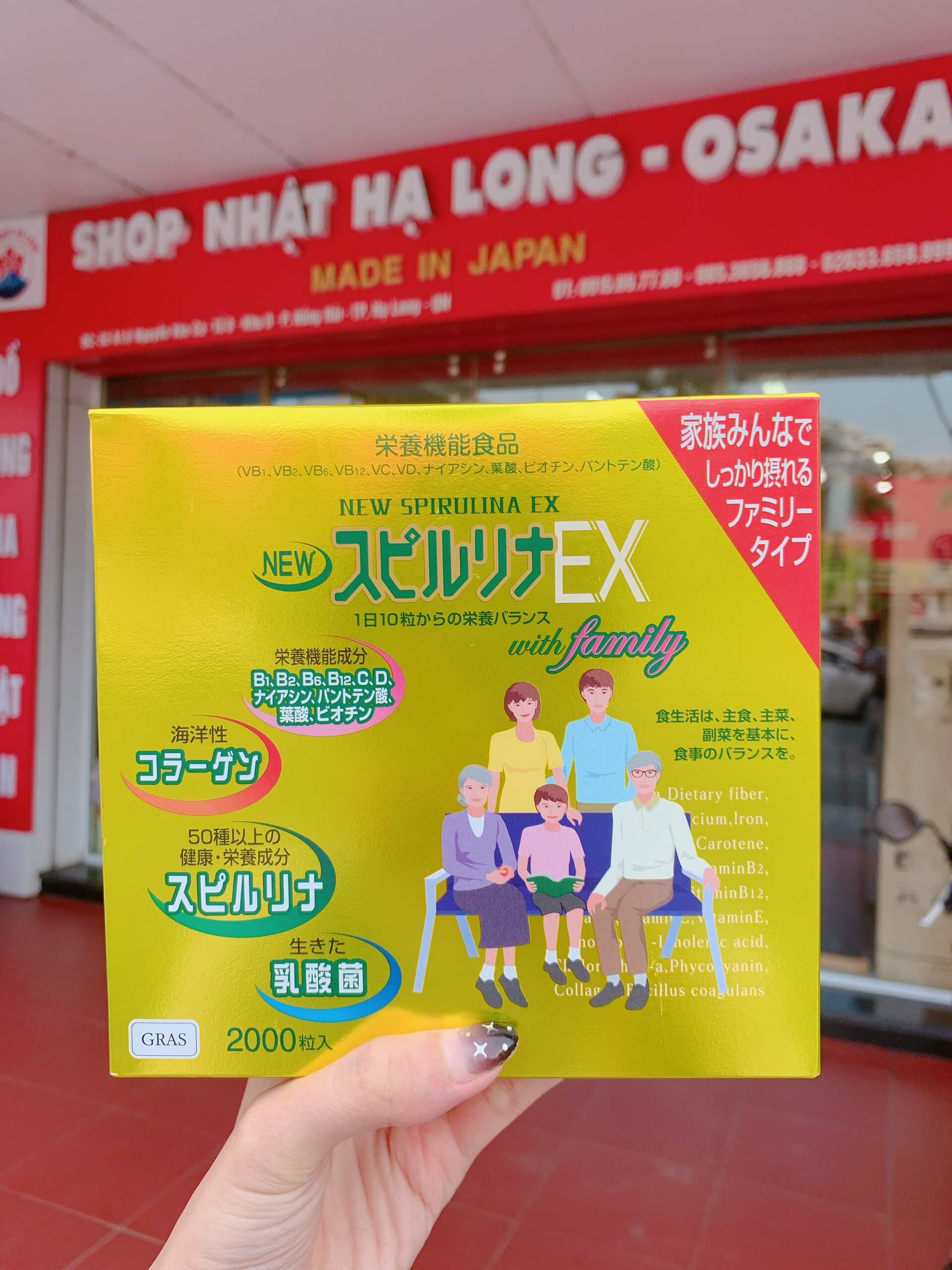 Tảo xoắn Spirulina EX with Family là thực phẩm bổ sung có chứa Tảo xoắn Spirulina với các chất dinh dưỡng (Vitamin B1, Vitamin B2, Vitamin B6, Vitamin B12, Vitamin C, Vitamin D, Niacin, Folic acid, Biotin, Axit Phantothenic…)