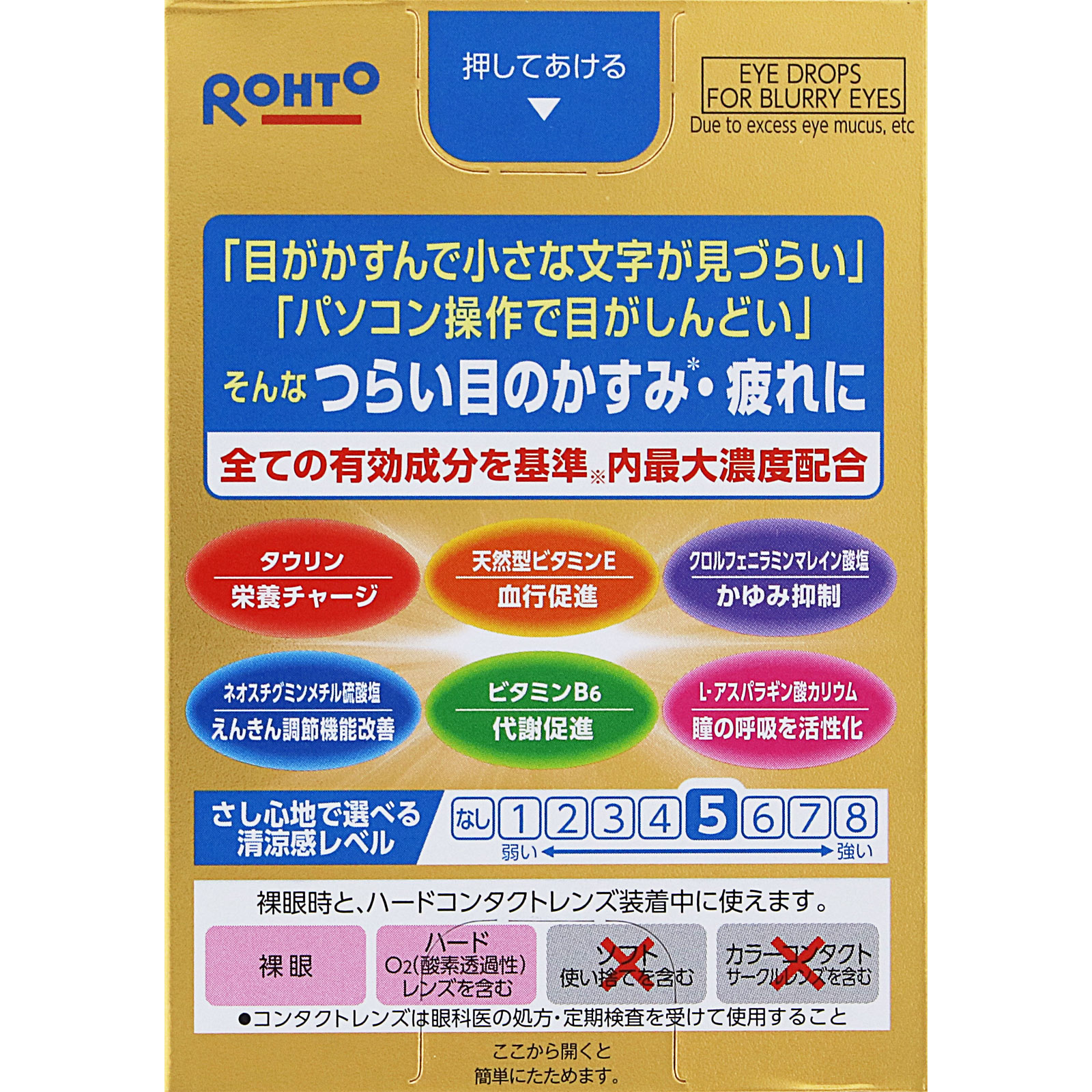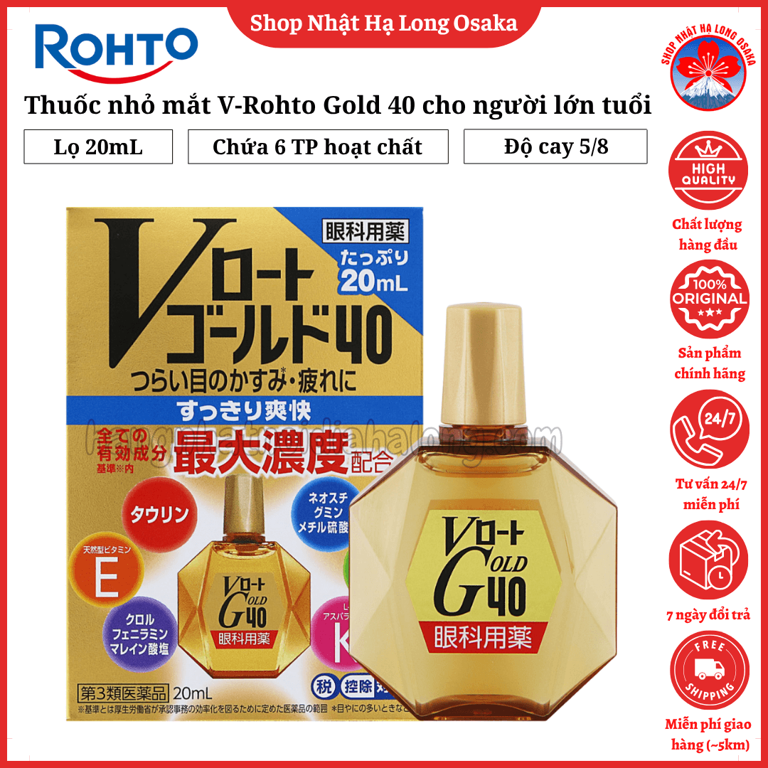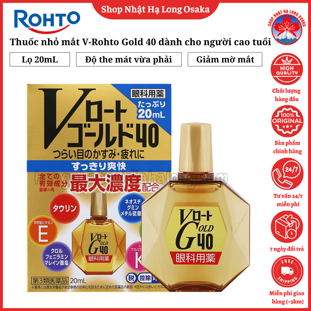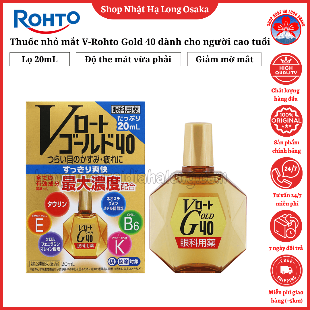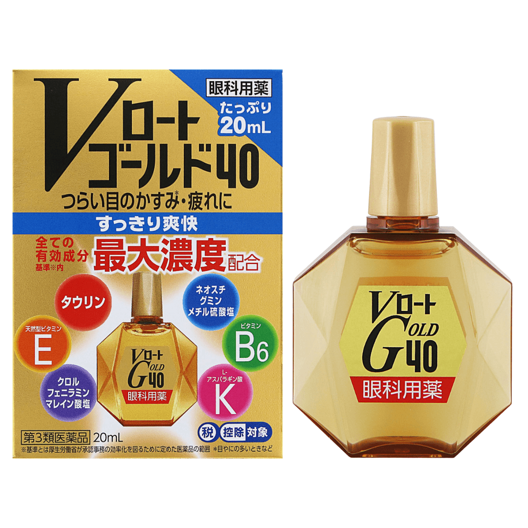 V Rohto Gold 40 là sản phẩm thuốc nhỏ mắt chuyên biệt dành cho người trung niên và cao tuổi, hỗ trợ cải thiện các vấn đề về mắt thường gặp như mờ mắt, mỏi mắt, chảy nước mắt, đau nhức do mắt bị khô hoặc tiết nhiều dịch. Sản phẩm chứa 6 thành phần hoạt chất ở nồng độ tối đa cho phép* theo tiêu chuẩn thuốc nhỏ mắt không kê đơn tại Nhật Bản, mang lại cảm giác mát lạnh, dịu nhẹ và sảng khoái ngay sau khi nhỏ.