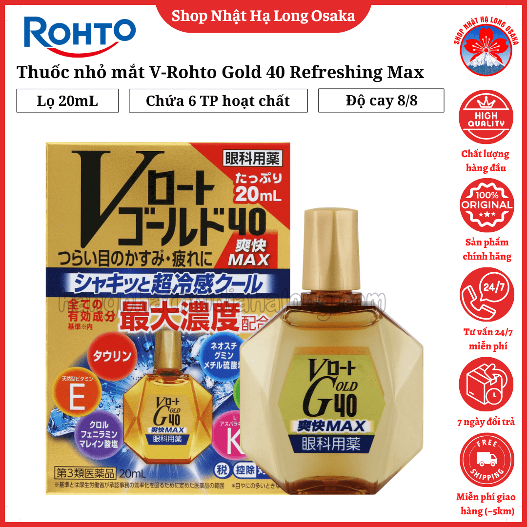 "V Rohto Gold 40 Refreshing Max" là thuốc nhỏ mắt không kê đơn (OTC loại 3) được phát triển dành riêng cho người trung niên và cao tuổi – nhóm đối tượng thường xuyên đối mặt với tình trạng mỏi mắt, mờ mắt, khó chịu do tác động của tuổi tác, môi trường hoặc thói quen sử dụng máy tính kéo dài. Sản phẩm chứa 6 thành phần hoạt tính quan trọng, bao gồm Taurine, Vitamin E tự nhiên, Vitamin B6, và các hoạt chất điều tiết giúp phục hồi chức năng mắt, hỗ trợ làm dịu tức thì và cải thiện rõ rệt tình trạng mỏi mắt.