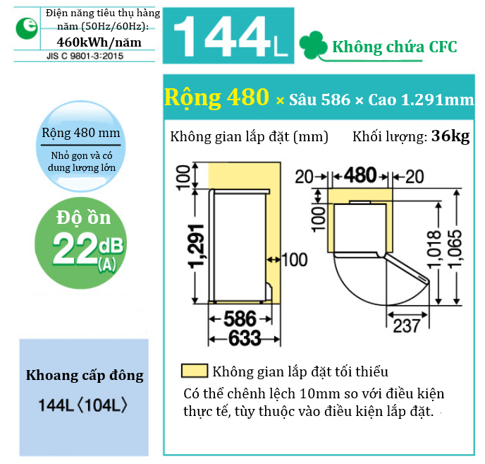 - Điện năng tiêu thụ hàng năm: 460kWh/năm