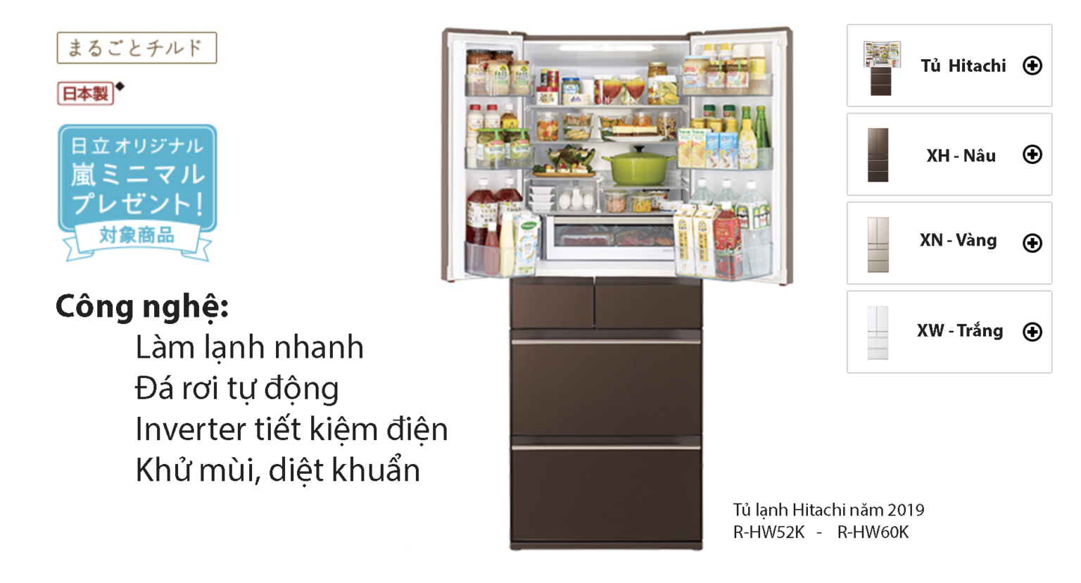 Tủ lạnh Hitachi R-HW52K có dung tích 520L có thể sử dụng bảo quản thực phẩm cho gia đình có từ 4-6 người. Tủ có 3 màu sắc chính: R-HW52K-XN vàng cát, R-HW52K-XW trắng, R-HW52K-XH mâu cafe. Thiết kế bên ngoài với viền bo mỏng, tinh tế hơn so với dòng tủ R-XG.