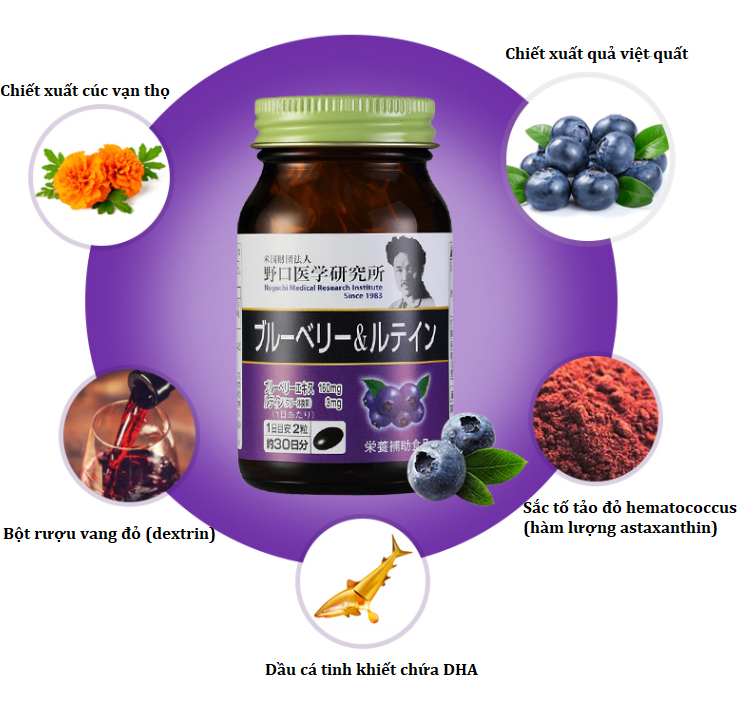 Viên uống bổ mắt Noguchi Blueberry Lutein Nhật Bản với chiết xuất 100% từ trái việt quất đến từ vùng hoang dã Bắc Âu, được kết hợp với các thành phần quan trọng cho mắt như Lutein, Vitamin A giúp khôi phục và duy trì sức khỏe cũng như chức năng cho đôi mắt. Lutein vừa là dưỡng chất cho mắt, vừa có vai trò chống oxy hóa, lọc tia tử ngoại bảo vệ mắt.