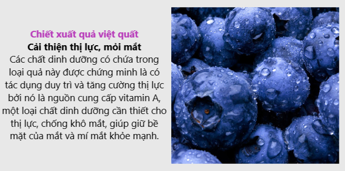 Chiết suất bổ sung chống oxy hóa từ Bluberry hỗ trợ bảo vệ và nuôi dưỡng các cấu trúc của mắt khỏi những tổn thương bên trong.