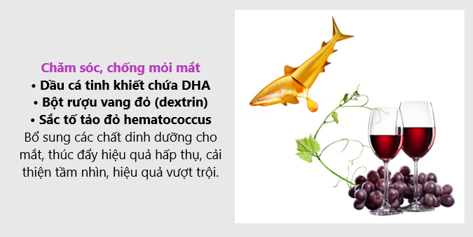 - Dầu cá tinh khiết chứa DHA, gelatin, chiết xuất quả việt quất, bột rượu vang đỏ (dextrin), glycerin, sáp ong, chiết xuất cúc vạn thọ (hàm lượng lutein, zeaxanthin), sắc tố tảo hematococcus (hàm lượng astaxanthin)