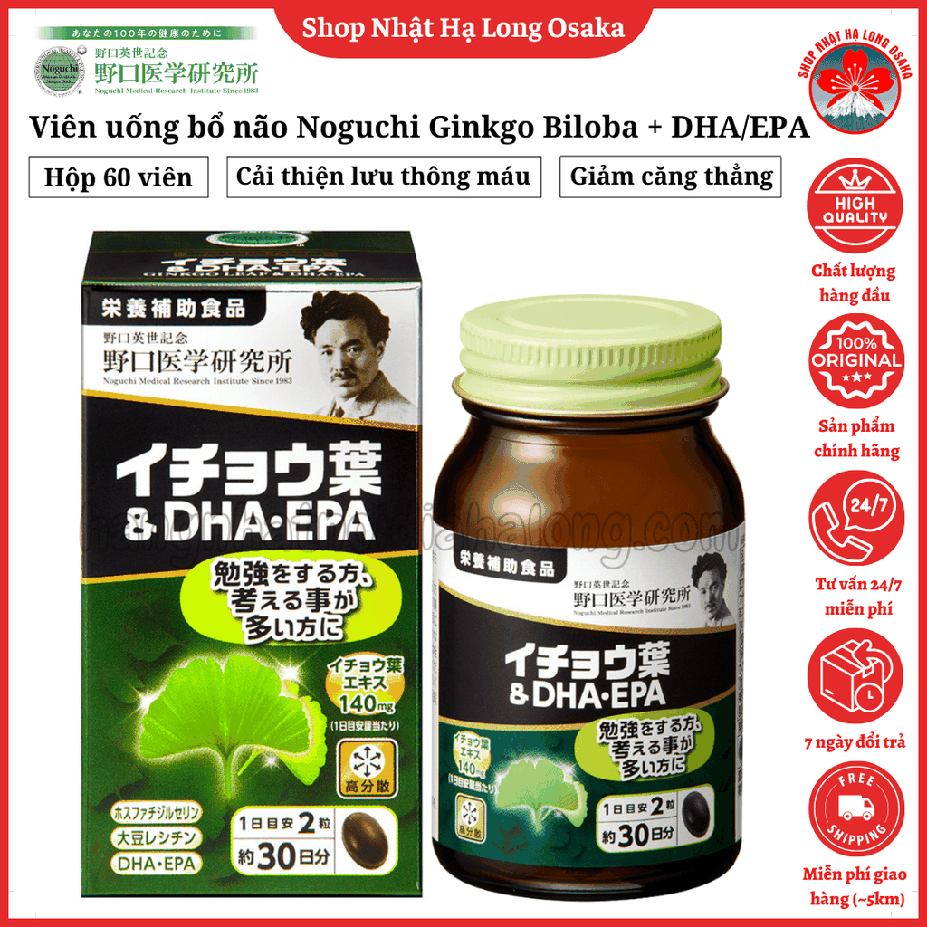 Viên uống bổ não Noguchi Ginkgo Biloba được nghiên cứu và sản xuất bởi Noguchi Medical Laboratory, thương hiệu uy tín hàng đầu Nhật Bản trong lĩnh vực thực phẩm chức năng. Sản phẩm là sự kết hợp chiết xuất lá bạch quả giàu Flavonoid glycoside và Terpenlactone cùng Omega-3 (DHA, EPA) từ dầu cá xanh, giúp duy trì và cải thiện trí nhớ, hỗ trợ tư duy minh mẫn và tăng khả năng tập trung.
