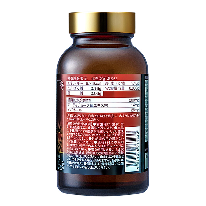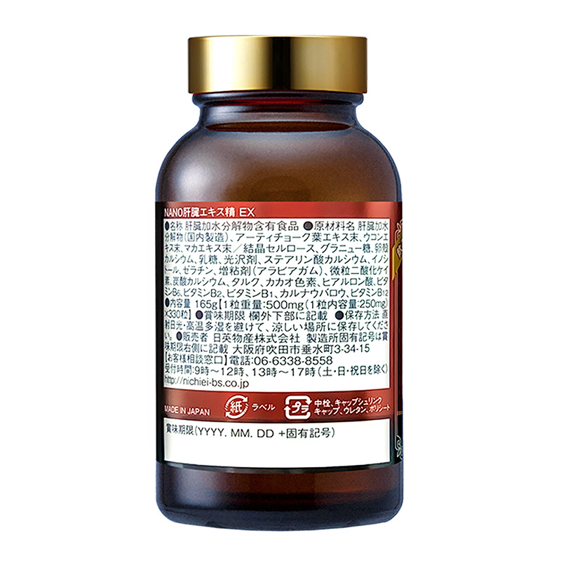 Nguyên liệu thô: Thủy phân gan (sản xuất tại Nhật Bản), bột chiết xuất lá atisô, bột chiết xuất nghệ, bột chiết xuất maca/cellulose tinh thể, đường hạt, canxi vỏ trứng, lactose, chất làm bóng, canxi stearat, inositol, gelatin, chất làm đặc (gôm arabic), silicon dioxide mịn, canxi cacbonat, talc, sắc tố ca cao, axit hyaluronic, vitamin B6, vitamin B2, vitamin B1, sáp carnauba, vitamin B12