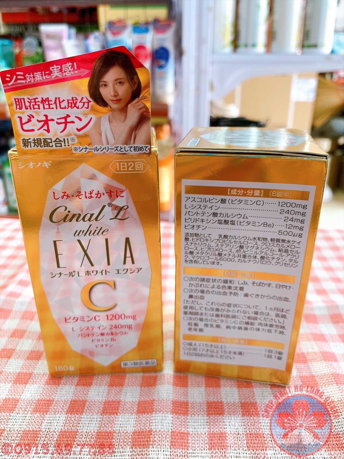 Viên uống trắng da Cinal L White Exia chứa 1200 mg vitamin C (liều hàng ngày cho người lớn) ngăn chặn việc sản xuất melanin - nguyên nhân chính gây ra các vết nám, tàn nhang, L-cysteine tham gia vào quá trình trao đổi chất của tế bào da và canxi pantothenate, vitamin B6 và biotin hỗ trợ hoạt động bình thường của da.