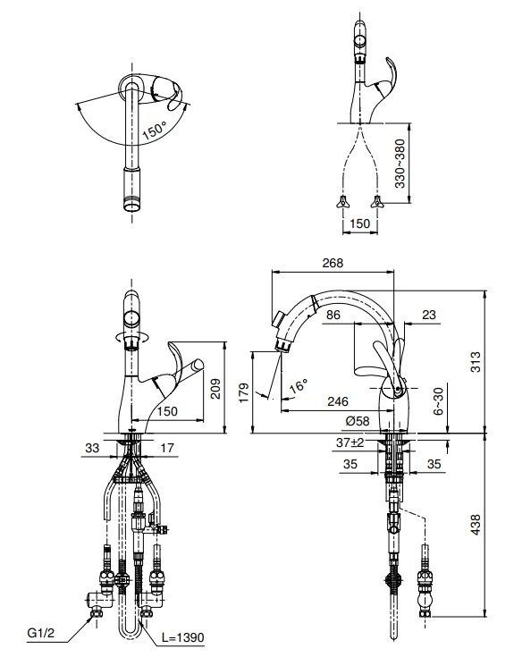 Công nghệ Eco, nước chảy trộn bọt khí giúp cho nước ra với cảm giác mạnh nhưng lại tiết kiệm nước, nước chảy ra theo dòng và không bị văng tung tóe giúp sử dụng tiện ích hơn. Thiết kế vòi theo dạng cổ ngỗng vòm cao giúp vòi rửa bát dễ dàng sử dụng khi rửa các xoong nồi to, các vật dụng nhà bếp lớn.