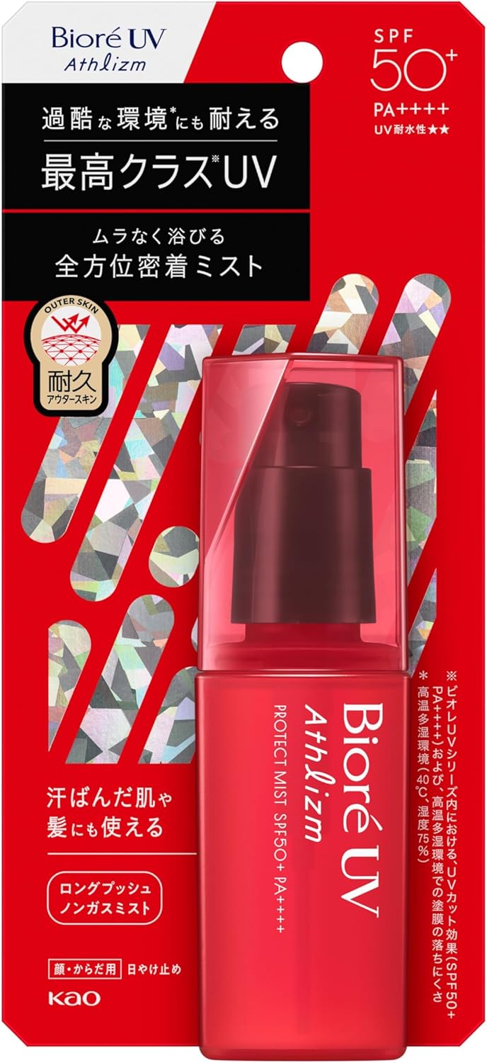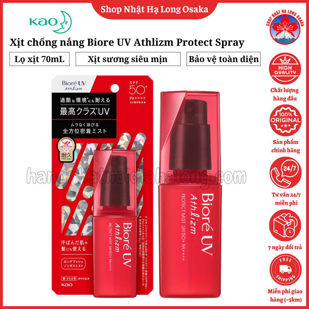 Xịt chống nắng Biore UV Athlizm Protect Spray SPF50+ PA++++ với công nghệ Tough Boost TECH, bảo vệ da trước tia UVA/UVB trong môi trường khắc nghiệt tới 40°C và 75% độ ẩm. Dạng sương siêu mịn phủ đều, thấm nhanh, không nhờn rít, không để lại vệt trắng. Dùng cho mặt & cơ thể, chống trôi khi đổ mồ hôi, có hương thảo mộc từ chiết xuất lá khuynh diệp. Dễ rửa sạch bằng xà phòng.